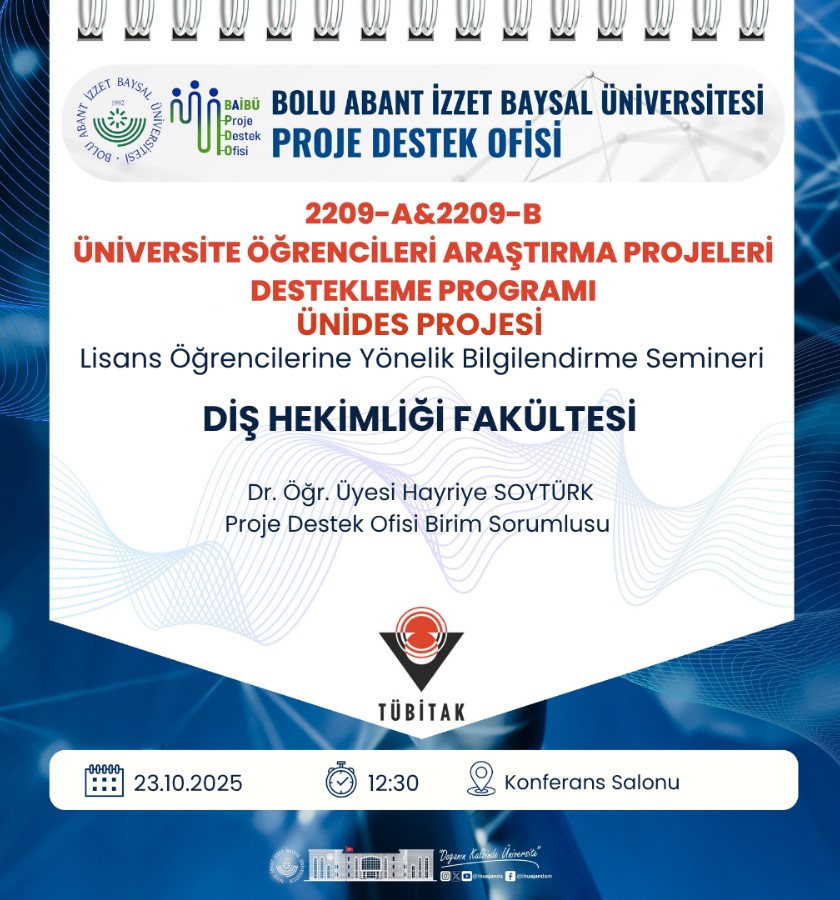 22 Ekim 2025 tarihinde Diş Hekimliği Fakültesi Konferans Salonu’nda düzenlenen TÜBİTAK 2209-A/B Üniversite Öğrencileri Araştırma Projeleri ve ÜNİDES Projesi Tanıtım ve Bilgilendirme Serisi-5 etkinliği, yoğun bir katılımla gerçekleştirildi.