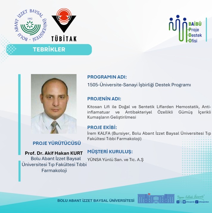 Bolu Abant İzzet Baysal Üniversitesi Tıp Fakültesi Tıbbi Farmakoloji Anabilim Dalı öğretim üyesi Prof. Dr. Akif Hakan Kurt yürütücülüğünde, YÜNSA iş birliğiyle ve BAİBÜ Teknoloji Transferi Uygulama ve Araştırma Merkezi (BAİBÜ-TTMER) koordinasyonunda gerçekleştirilen “Kitosan Lifi ile Doğal ve Sentetik Liflerden Hemostatik, Anti-inflamatuar ve Antibakteriyel Özellikli Gümüş İçerikli Kumaşların Geliştirilmesi” başlıklı proje, Üniversite–Sanayi İş Birliği Destek Programı kapsamında TÜBİTAK tarafından desteklenmeye hak kazanmıştır.
