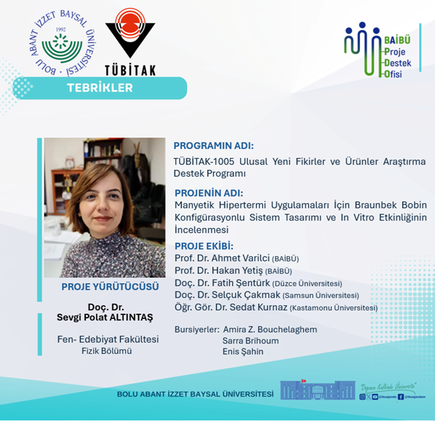 Üniversitemiz Fen- Edebiyat Fakültesi Fizik bölümü öğretim üyesi Doç. Dr. Sevgi Polat Altıntaş’ın yürütücülüğündeki 'Manyetik Hipertermi Uygulamaları İçin Braunbek Bobin Konfigürasyonlu Sistem Tasarımı ve In Vitro Etkinliğinin İncelenmesi”' başlıklı TÜBİTAK-1005 Ulusal Yeni Fikirler ve Ürünler Araştırma Destek Programı kapsamındaki projesi kabul edilmiştir.
